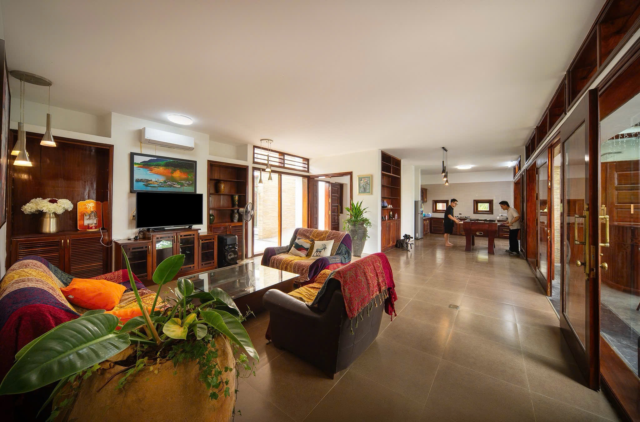 · Không gian phòng khách tại tầng 1 đầy đủ tiện nghi như: tivi, bàn Bi lắc, điều hòa, bàn ghế sofa, loa tivi,