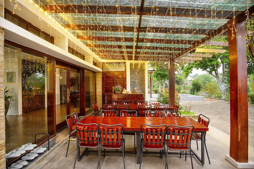 · Khu vực bàn ăn ngoài trời tầng 1 bằng gỗ gõ đỏ có sức chứa lớn (khoảng 20 người).