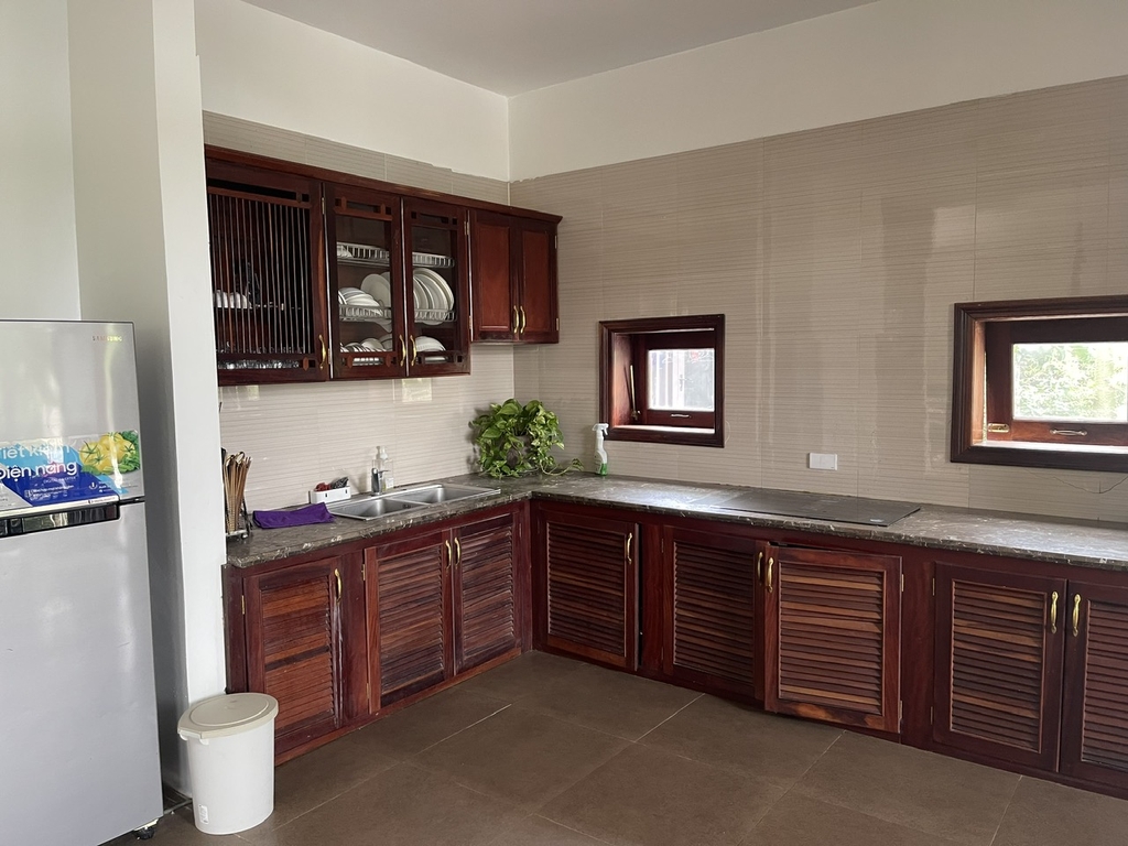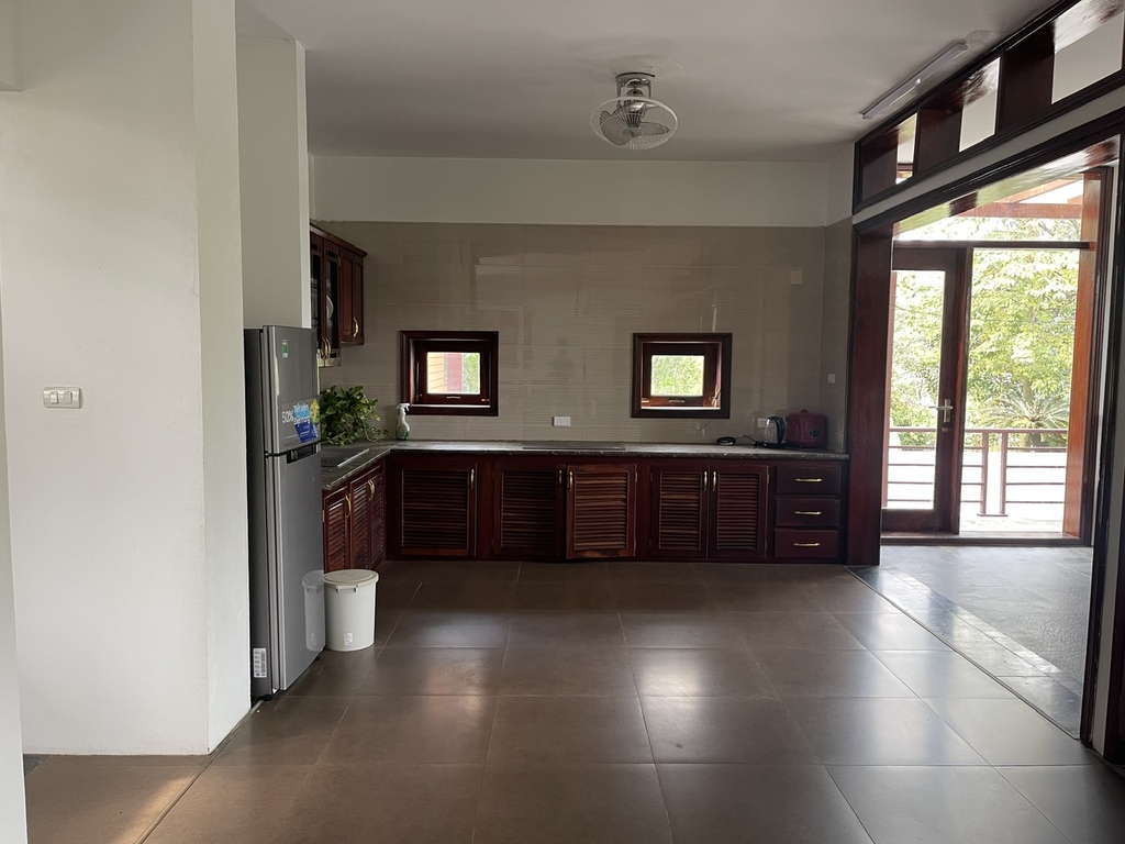 · Phòng bếp và phòng ăn liền nhau bao gồm: Bếp ga, tủ lạnh, máy lọc nước, điều hòa, bộ bàn ghế ăn 8 người view hướng hồ, đầy đủ bát đĩa xoong nồi.